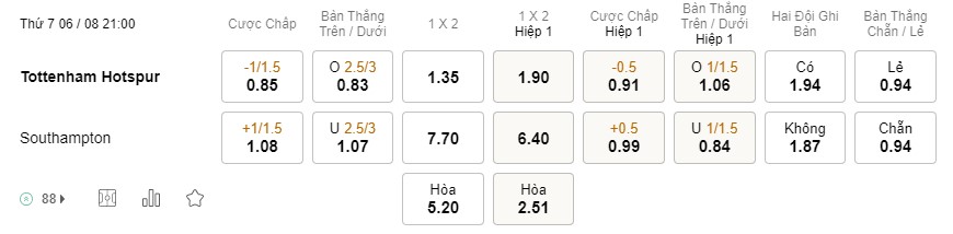 Soi kèo Châu Á Tottenham vs Southampton: 0.85*1/1.5*1.08