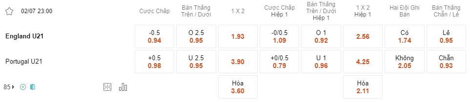 Tỉ lệ kèo U21 Anh vs U21 Bồ Đào Nha