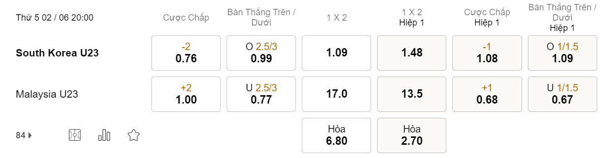 Soi kèo hiệp 1 U23 Hàn Quốc vs U23 Malaysia: 1.08*1*0.68