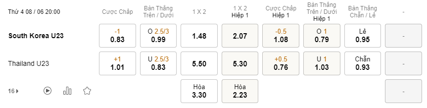 Soi kèo hiệp 1 U23 Hàn Quốc vs U23 Thái Lan: 1.08*0.5*0.76