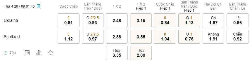 Soi kèo hiệp 1 Ukraine vs Scotland: 0.84*0*1.04