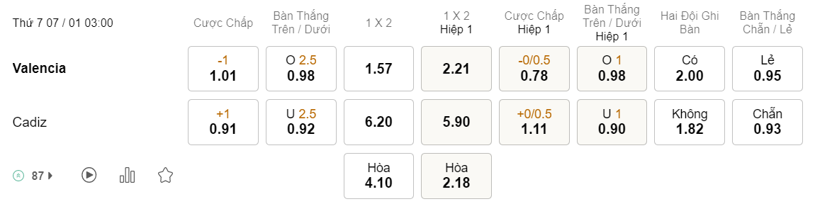 Soi kèo châu Á Valencia vs Cadiz: 1.01*1*0.91