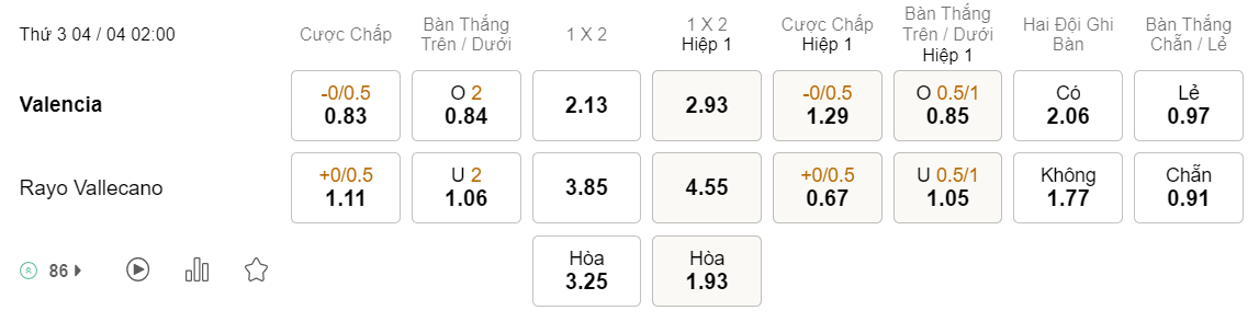 Soi kèo châu Á Valencia vs Vallecano: 0.83*0/0.5*1.11