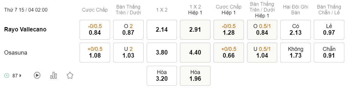 Soi kèo tài xỉu Vallecano vs Osasuna: 0.87*2*1.03
