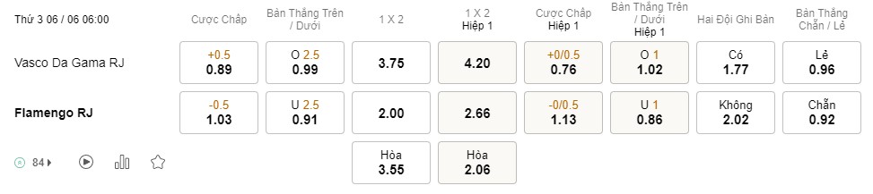 Soi kèo hiệp 1 Vasco da Gama vs Flamengo: 0.76*0/0.5*1.13