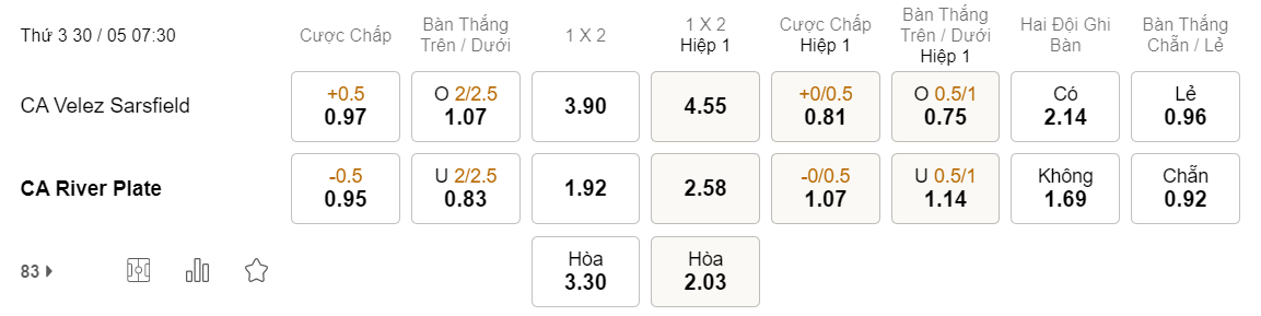 Soi kèo hiệp 1 Velez vs River Plate: 0.81*0/0.5*1.07