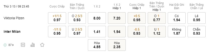 Soi kèo châu Á Viktoria Plzen vs Inter: 0.97*1/1.5*0.95