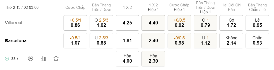 Soi kèo châu Á Villarreal vs Barcelona: 0.86*0.5/1*1.07