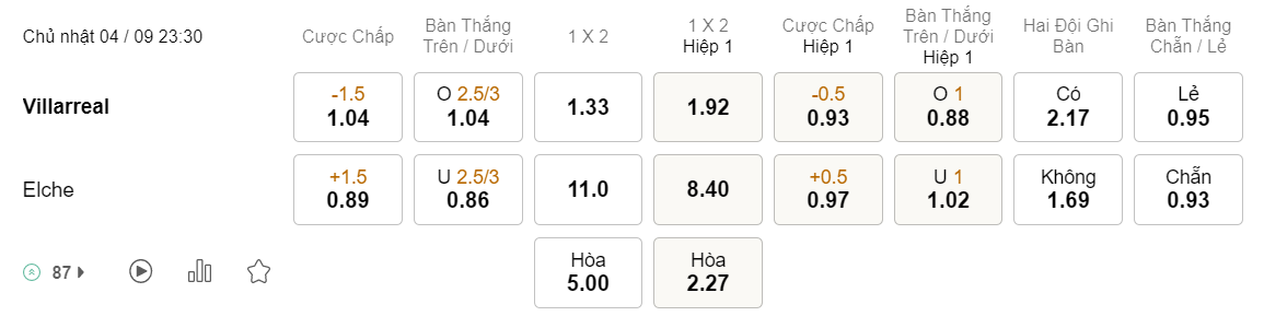 Soi kèo châu Á Villarreal vs Elche: 1.04*1.5*0.89