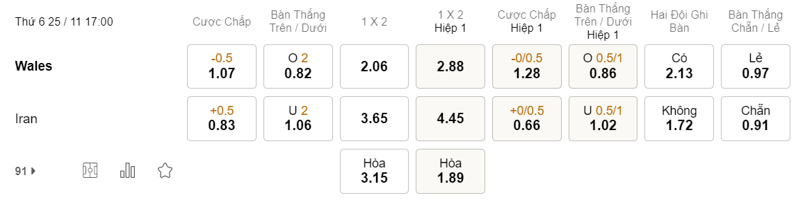 Soi kèo tài xỉu Wales vs Iran: 0.82*2*1.06