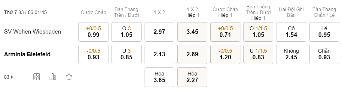 Soi kèo hiệp 1 Wehen Wiesbaden vs Bielefeld: 0.71*0/0.5*1.20