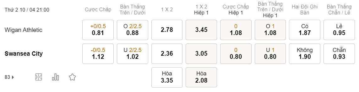 Soi kèo hiệp 1 Wigan vs Swansea: 1.08*0*0.80