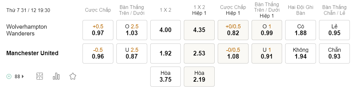Soi kèo hiệp 1 Wolves vs MU: 0.82*0/0.5*1.08
