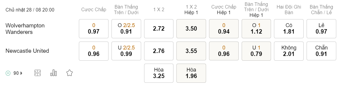 Soi kèo tài xỉu Wolves vs Newcastle: 0.91*2/2.5*0.99