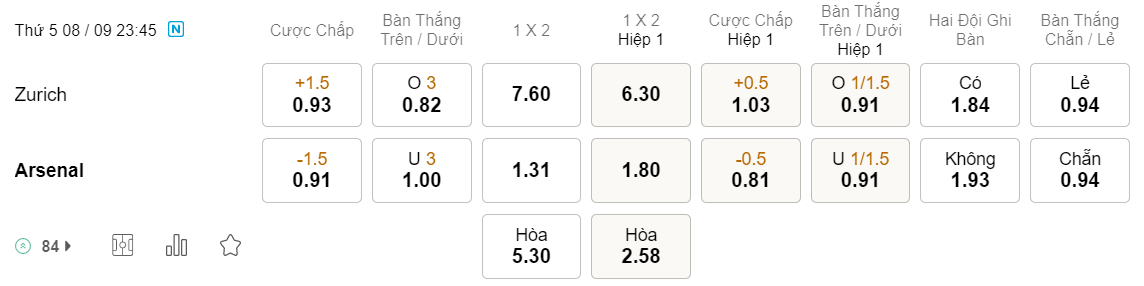 Soi kèo châu Á Zurich vs Arsenal: 0.93*1.5*0.91